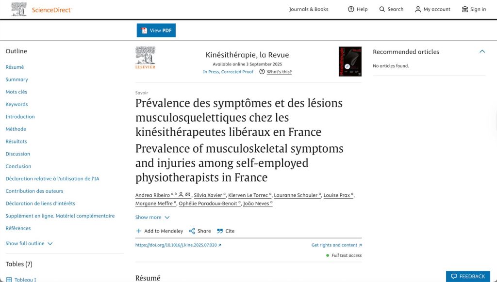 “Kinésithérapie, la Revue”, da prestigiada editora Elsevier, é uma revista científica reconhecida internacionalmente na área da Fisioterapia e Reabilitação. Publicando trabalhos de autores de diversos países e indexada em bases de dados internacionais, a sua seleção rigorosa garante visibilidade global para os artigos publicados.”