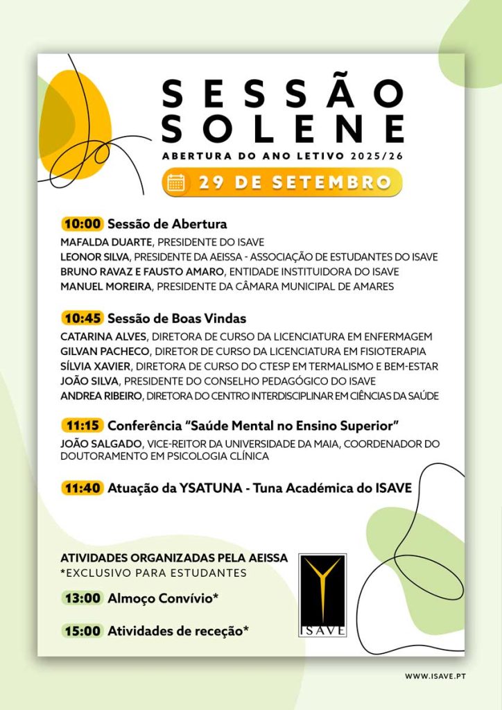 Com esta Sessão Solene, o ISAVE assinala o início de mais um ano letivo, reforçando o compromisso com a formação de excelência na área da saúde e o envolvimento ativo com a comunidade académica e local.